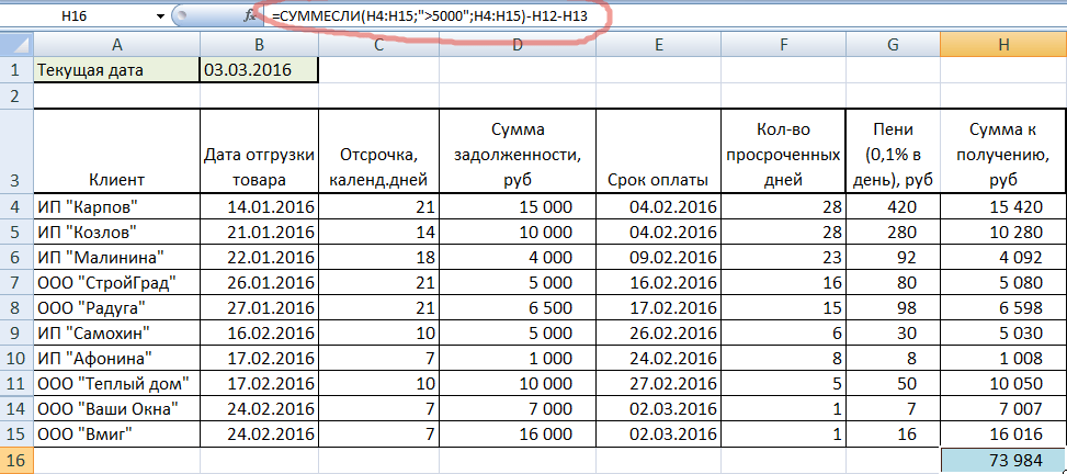 Предположим, что судебные издержки составляют 5000 рублей на одного клиента. Подсчитаем внизу сумму, которую мы сможем получить после подачи в суд на тех, у кого задолженность более 5000. Для этого понадобится функция СУММЕСЛИ.